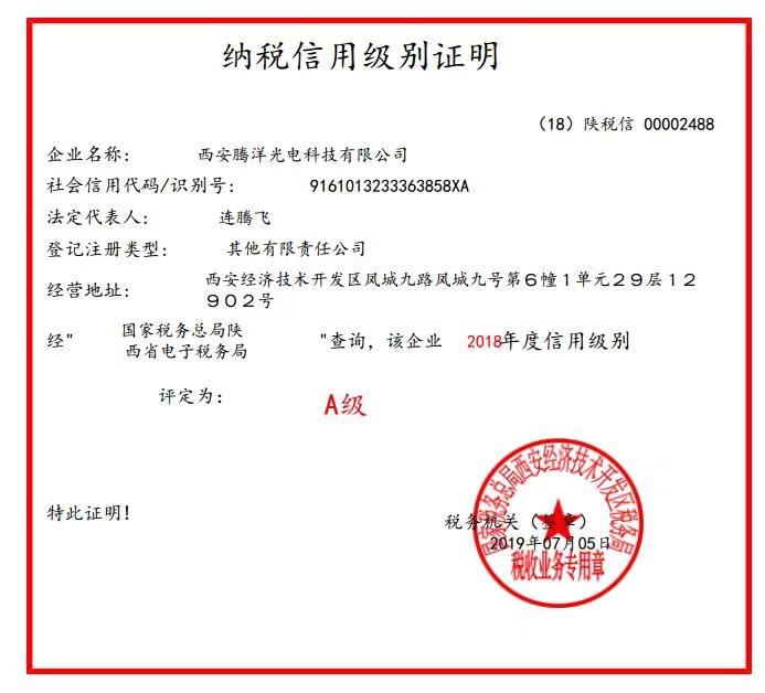 2018年被陕西国家税务局评定为A级纳税企业。